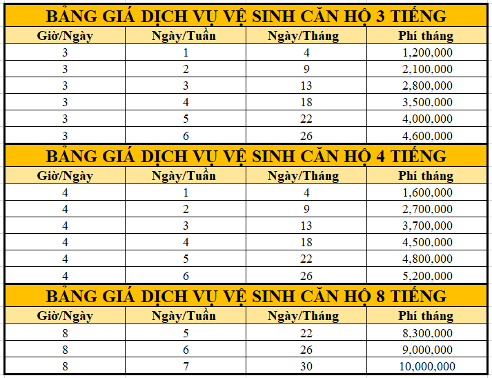 Bảng giá các gói dịch vụ vệ sinh căn hộ của Dịch Vụ Vệ Sinh Nhà YourCare